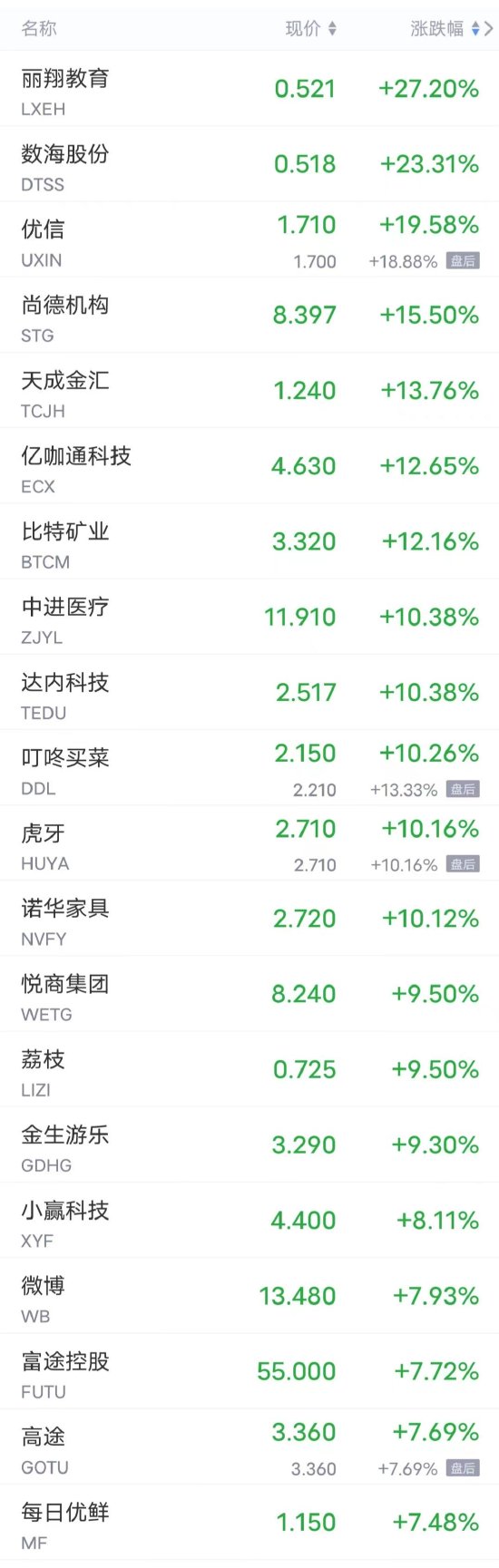 丽翔教育涨超27%,数海股份涨超23%,优信涨超19%,尚德机构涨超15%,天成金汇涨超13%,亿咖通科技,比特矿业涨超12%,达内科技,中进医疗,叮咚买菜,虎牙,诺华家具涨超10%,悦商集团,荔枝,金生游乐涨超9%,小赢科技涨超8%,微博,富途控股,高途,每日优鲜涨超7%,祁连国际,禾塞科技,UT斯达康,腾讯音乐等涨超6%。