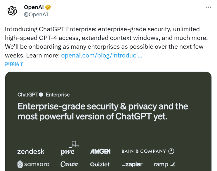 目前,OpenAI已经与20多家公司达成合作,从小型初创公司到大型科技公司,这些公司在人工智能方面拥有丰富的经验,以测试ChatGPT企业版。现有的用户包括化妆品公司雅诗兰黛公司、软件制造商Canva和自动化平台Zapier等。据OpenAI称,该产品的早期客户正在使用它来完成编码、帮助完成创造性工作和回答业务问题等任务。