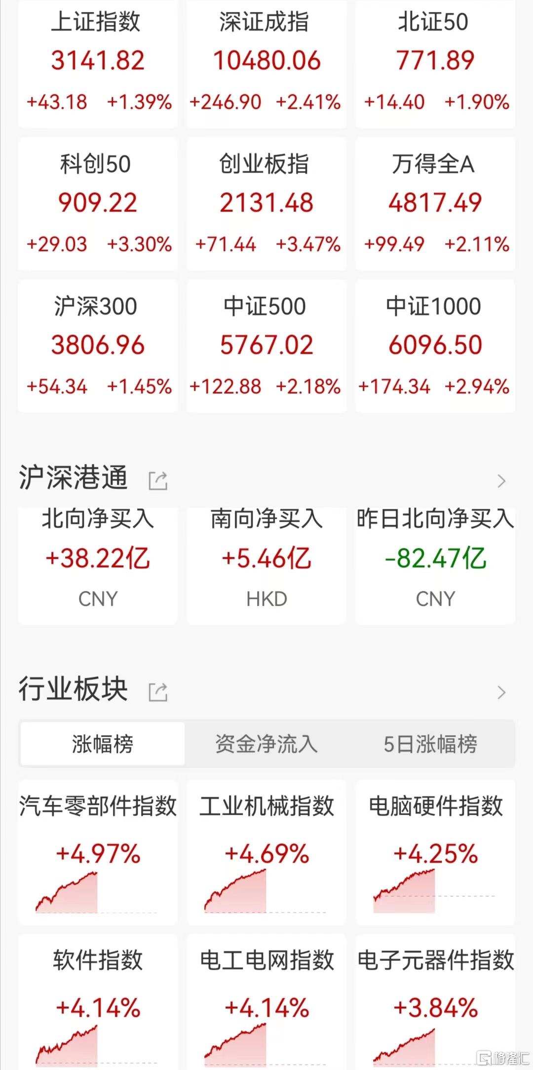 周末“四箭齐发”利好政策后劲十足,A股主要指数低开高走,截至午间收盘,上证指数涨1.39%报3141点,深证成指涨2.41%,创业板指涨3.47%。两市超4700股上涨,半日成交额6265亿元,北上资金净买入38.19亿元。盘面上,机器人板块掀涨停潮,百胜智能、昊志机电20cm涨停;汽车股震荡走强,星源卓镁等多股涨停;稀土永磁板块拉升,金力永磁涨超8%;工业母机概念股走强,拓斯达涨逾19%;CRO板块拉升,金凯生科涨超9%;算力概念股走高,中贝通信涨停;传媒影视、无人驾驶及国资云等板块涨幅居前。另外,大金融板块震荡走低,华鑫股份领跌;环保板块持续走低,正和生态一度跌停;核污染概念震荡回落,中电环保跌超6%;水产养殖持续走弱,百洋股份此前触及跌停。