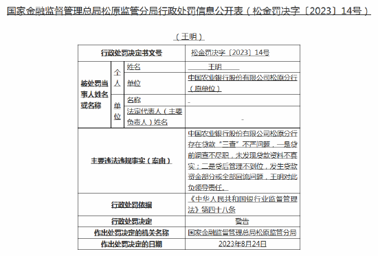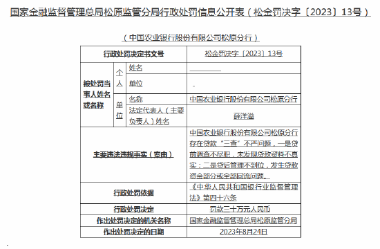 8月30日金融一线消息,据国家金融监督管理总局网站发布的行政处罚信息公开表显示,中国农业银行股份有限公司松原分行因存在贷款“三查”不严问题被罚款30万元,两名相关责任人被警告。
