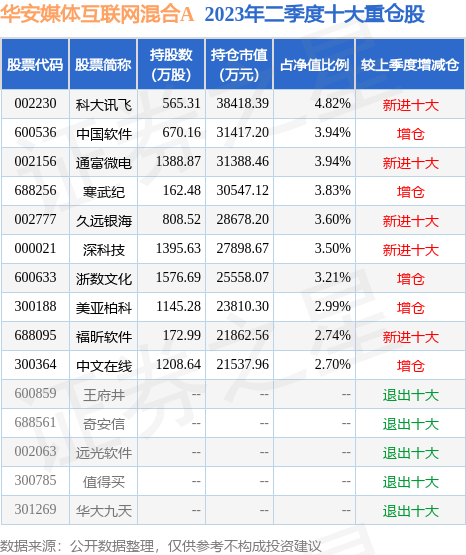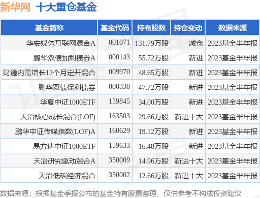 根据2023基金半年报公募基金重仓股数据,重仓该股的公募基金共25家,其中持有数量最多的公募基金为华安媒体互联网混合A。华安媒体互联网混合A目前规模为62.19亿元,最新净值2.879(8月29日),较上一交易日上涨3.67%,近一年下跌3.12%。该公募基金现任基金经理为胡宜斌。胡宜斌在任的基金产品包括:华安智能生活混合A,管理时间为2019年5月8日至今,期间收益率为115.23%;华安成长创新混合A,管理时间为2019年6月27日至今,期间收益率为95.06%;华安沪港深外延增长灵活配置混合A,管理时间为2022年1月26日至今,期间收益率为-17.21%。