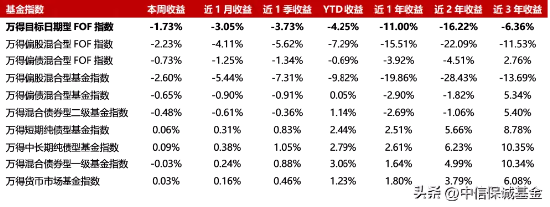 8/17-8/23期间,中长期纯债与短债基金指数为正收益,一级债基指数受转债下行影响下跌-0.03%。含权益类资产的各类基金受市场拖累本周整体仍为负收益,目标日期型FOF指数下跌-1.73%,跌幅介于偏股型FOF与偏债型FOF之间,今年以来收益为-4.25%,跌幅小于偏股混合型FOF与偏股混合型基金指数,今年以来累计收益为正值的目标日期FOF占比为5.7%。