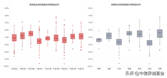 主动权益基金方面,多数基金本周为负收益,大盘基金跌幅低于中小盘基金,均衡与价值型基金优于成长。主题基金方面,消费、周期、医药与金融主题表现较强,重配制造与科技板块的基金本周跌幅较大。