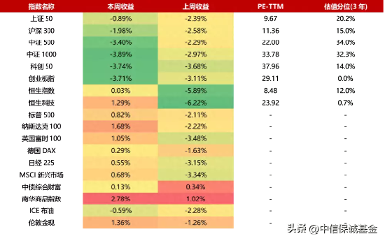 上周(2023/8/21-2023/8/25),A股震荡下行,悲观情绪加重,主要股指表现分化,大盘蓝筹板块有所企稳,中小盘与成长板块跌幅多在3%以上。板块间轮动较频繁,核废水相关、AI与数据要素、地产与城中村改造、黄金、机构抱团的红利等先后成为交易热点,但行情的演绎时间仍较短。经济基本面虽暂未见显著拐点信号,但进入防御区间的股指已具备一定配置性价比,随着活跃资本市场的四大政策出台,对短期市场情绪改善将起到积极作用。港股本周表现优于A股,恒生科技上涨1.29%。因交易流动性宽松预期,海外主要股票市场、黄金与商品指数均整体上行。