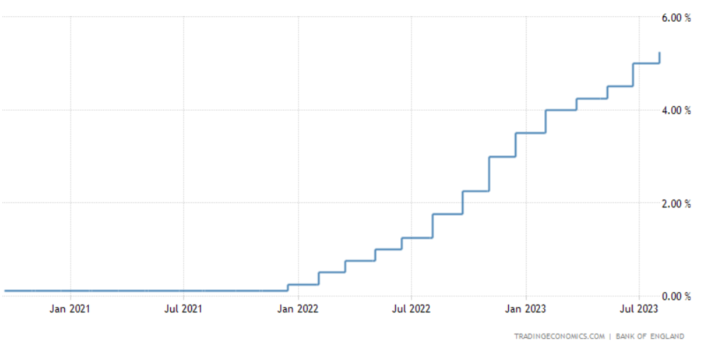 从2021年底开始,英国央行已经连续14次加息,政策利率从0.1%拉升至5.25%。目前市场预期,在9月议息会议上,英国央行将祭出连续第15次加息。