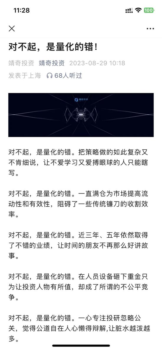 8月29日,量化私募靖奇投资在其官方公众号发布文章《对不起,是量化的错!》。文中,靖奇投资合伙人唐靖人通篇反讽,反驳道:“我们是量化,我们是最坚定的做多者,永远满仓热泪盈眶,永远相信国运相信光!我们不背锅!”