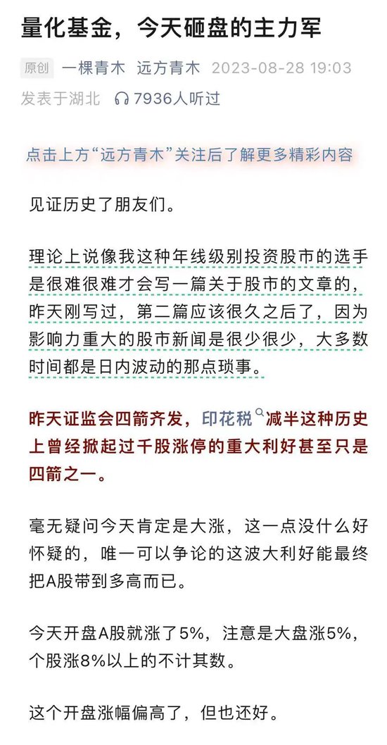 随后,部分市场人士将“枪口”对准量化,认为量化是“砸盘主力”。知名财经大V“远方青木”撰文《量化基金,今天砸盘的主力军》,阅读量达10万+。