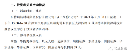8月30日,贝特瑞发布《投资者关系活动记录表》,显示在今天举办的投资者调研活动上,迎来了高盛、瑞银证券、华能贵诚信托、景元天成、远致瑞信、东吴证券、国信证券、华安证券、华泰证券、国泰君安、国金证券等38家机构上门。
