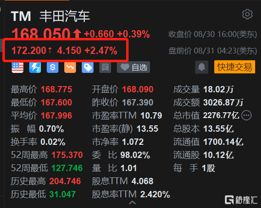 丰田汽车(TM.US)盘前涨2.47%报172.2美元。公司7月全球产量为80.94万辆,较上年同期增长14.6%。丰田今年首次将生产超过1000万辆汽车,计划在8月至12月期间加快生产速度,平均每月生产90万辆汽车。在中国市场,丰田与本地车商等的竞争激烈,销量增长乏力,7月下滑15.4%至15.2717万辆。