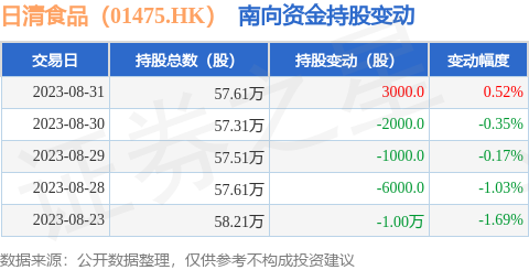 8月31日北向资金增持3000.0股日清食品(01475.HK)。近5个交易日中,获南向资金减持的有4天,累计净减持1.6万股。近20个交易日中,获南向资金减持的有10天,累计净减持2.8万股。截至目前,南向资金持有日清食品(01475.HK)57.61万股,占公司已发行普通股的0.05%。