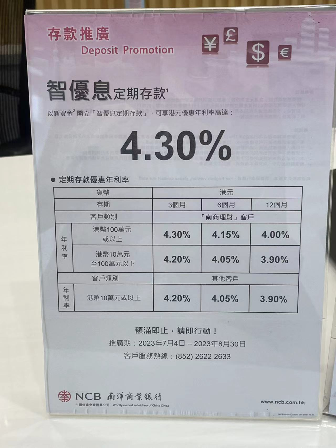 券商中国记者走访发现,除去短期阶段利率和高起存金额外,大部分香港商业3个月、6个月定期存款利率均在3.1%至3.5%之间,少数银行达4%年化利率及以上。