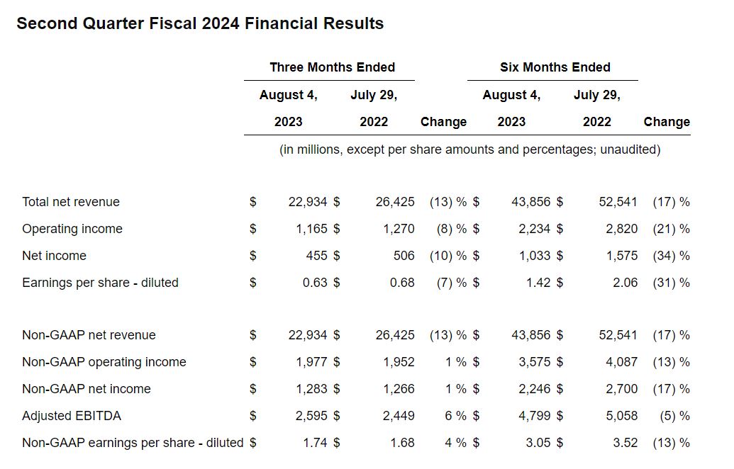 美东时间8月31日盘后,戴尔公布了2024财年第二财季财报。财报显示,在截至8月4日的第二财季中,戴尔总收入达到229亿美元,同比下降13%,环比增长10%,高于市场预期的209亿美元;非美国通用会计准则(Non-GAAP)下净利润为12亿美元,同比增长1%;每股摊薄收益为0.63美元,同比下降7%;Non-GAAP每股摊薄收益为1.74美元,同比增长4%,高于市场预期的1.14美元。