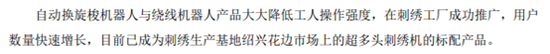 据大豪科技半年报介绍,公司推出的自动换旋梭机器人与绕线机器人产品,“大大降低工人操作强度,在刺绣工厂成功推广,用户数量快速增长,目前已成为刺绣生产基地绍兴花边市场上的超多头刺绣机的标配产品”。