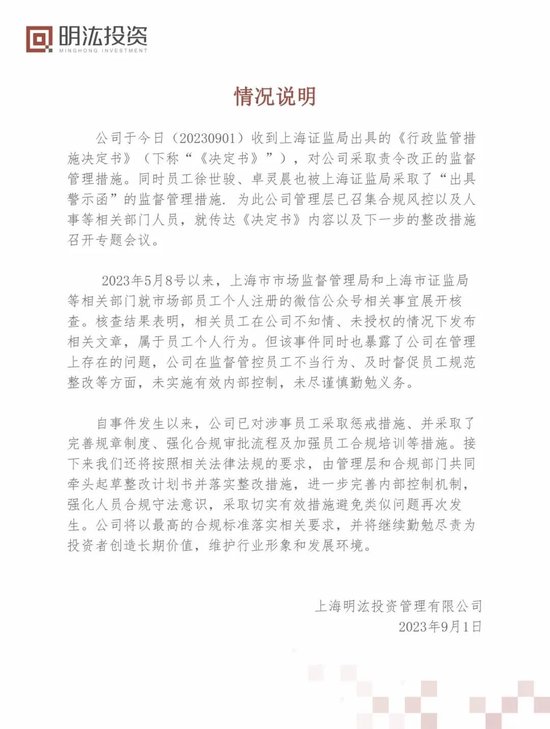 9月1日晚间,明汯投资也发来了声明,其中提到,为此公司管理层已召集合规风控以及人事等相关部门人员,就传达《决定书》内容以及下一步的整改措施召开专题会议。
