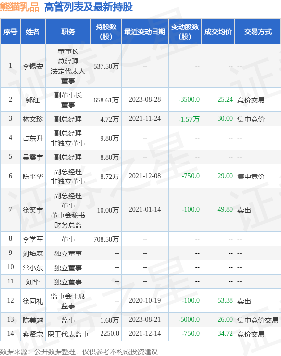 熊猫乳品近半年内的董监高及核心技术人员增减持详情如下: