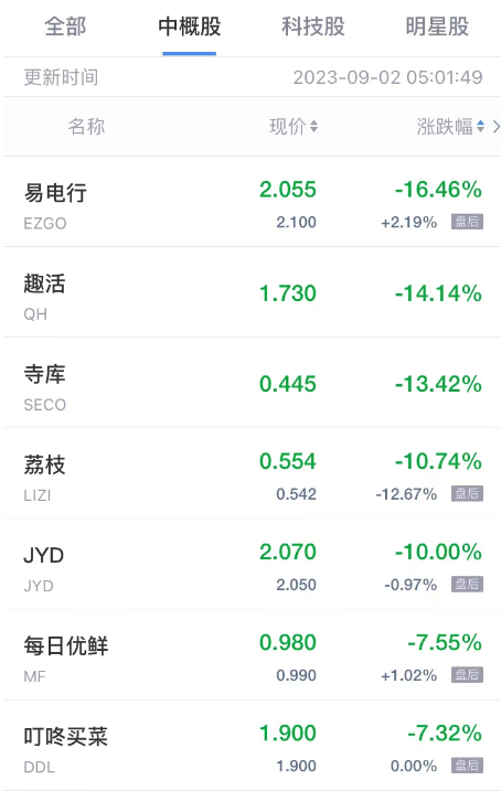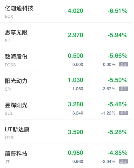 易电行跌超16%,叮咚买菜跌超7%,亿咖通科技跌超6%,思享无限跌超5%,趣店、世纪互联、迅雷跌超3%,嘉银金科跌超2%,水滴公司、亿航、能链智电、嘉楠科技跌超1%,逸仙电商、格林酒店跌近1%。