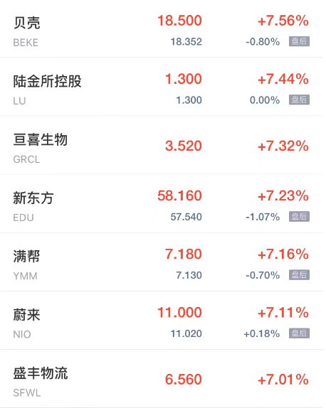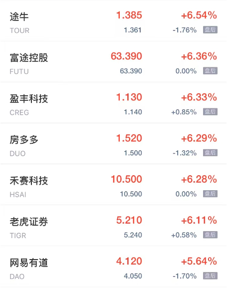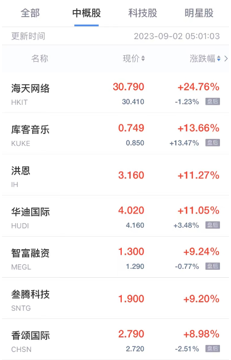 海天网络涨超24%,洪恩涨超11%,大健云仓涨超8%,贝壳、陆金所、亘喜生物、新东方、满帮、蔚来、盛丰物流涨超7%,达达集团、途牛、富途控股、禾赛科技、老虎证券涨超6%,网易有道、小牛电动、微博、小鹏汽车涨超5%,知乎、百家云、拼多多、360数科、BOSS直聘涨超4%,华住酒店集团、雾芯科技、涂鸦智能涨超3%,哔哩哔哩、斗鱼、腾讯音乐、小i机器人、万国数据、携程、京东、唯品会、百度、小赢科技、金融壹帐通、WSP控股、阿里巴巴、高途涨超2%,拓臻生物、普益财富、理想汽车、爱奇艺、欢聚集团、尚德机构、金山云、汽车之家、优品车、亚朵集团、阿特斯涨超1%。网易、量子之歌涨近1%。