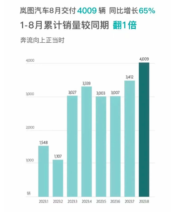 9月1日,东风旗下新能源品牌岚图汽车公布的数据显示,8月岚图交付新车4009辆,同比增长65%,环比增长17%。前8月岚图累计销量同比翻一倍,销量创下历史新高。