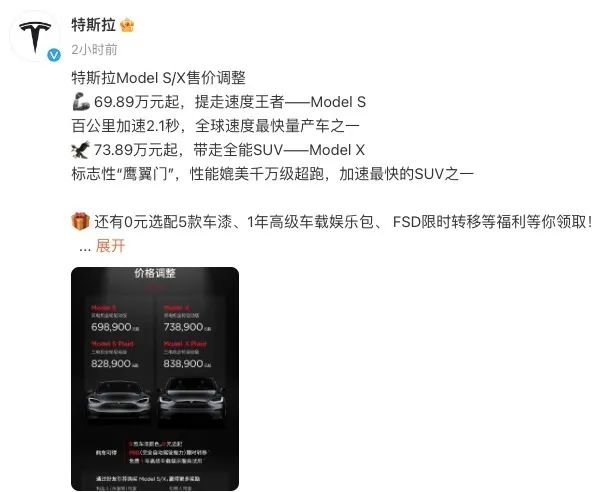 除Model 3外,特斯拉的降价动作也在其他在售车型上继续体现。9月1日,特斯拉宣布对Model S、Model X全系车型进行价格调整,下调幅度达11万元~22万元。其中,Model S双电机全轮驱动版起售价69.89万元,Model S Plaid三电机全轮驱动版82.89万元起售;Model X双电机全轮驱动版起售价73.89万元,Model X Plaid三电机全轮驱动版83.89万元起售。