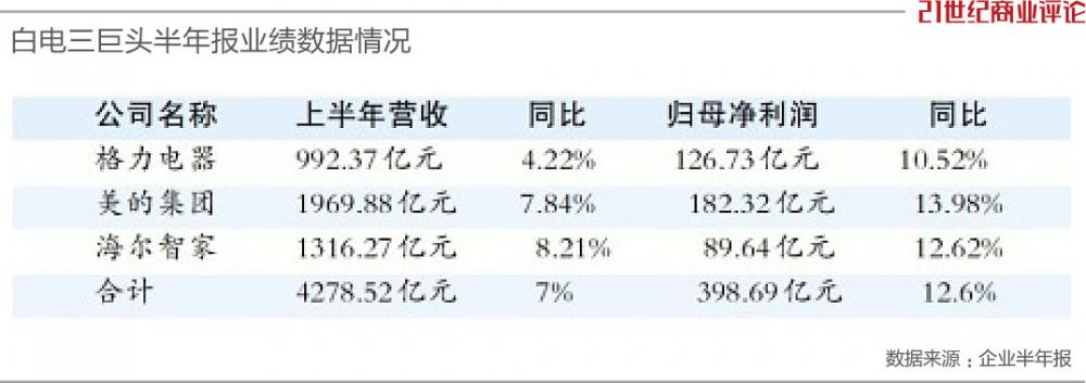 从营收规模来看,1-6月,美的以1969.88亿元的营收位列第一,同比增长7.84%;海尔智家、格力电器分别为1316.27亿元、992.37亿元,同比增长8.21%、4.22%。