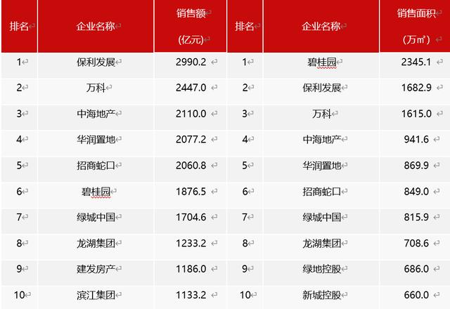 根据中指研究院统计,前8个月销售额前十名房企依次为保利发展、万科、中海地产、华润置地、招商蛇口、碧桂园、绿城中国、龙湖集团、建发房产、滨江集团;而克而瑞研究中心统计的前六名与中指研究院一致,后四位排名略有不同,分别为龙湖集团、建发房产、绿城中国和滨江集团。