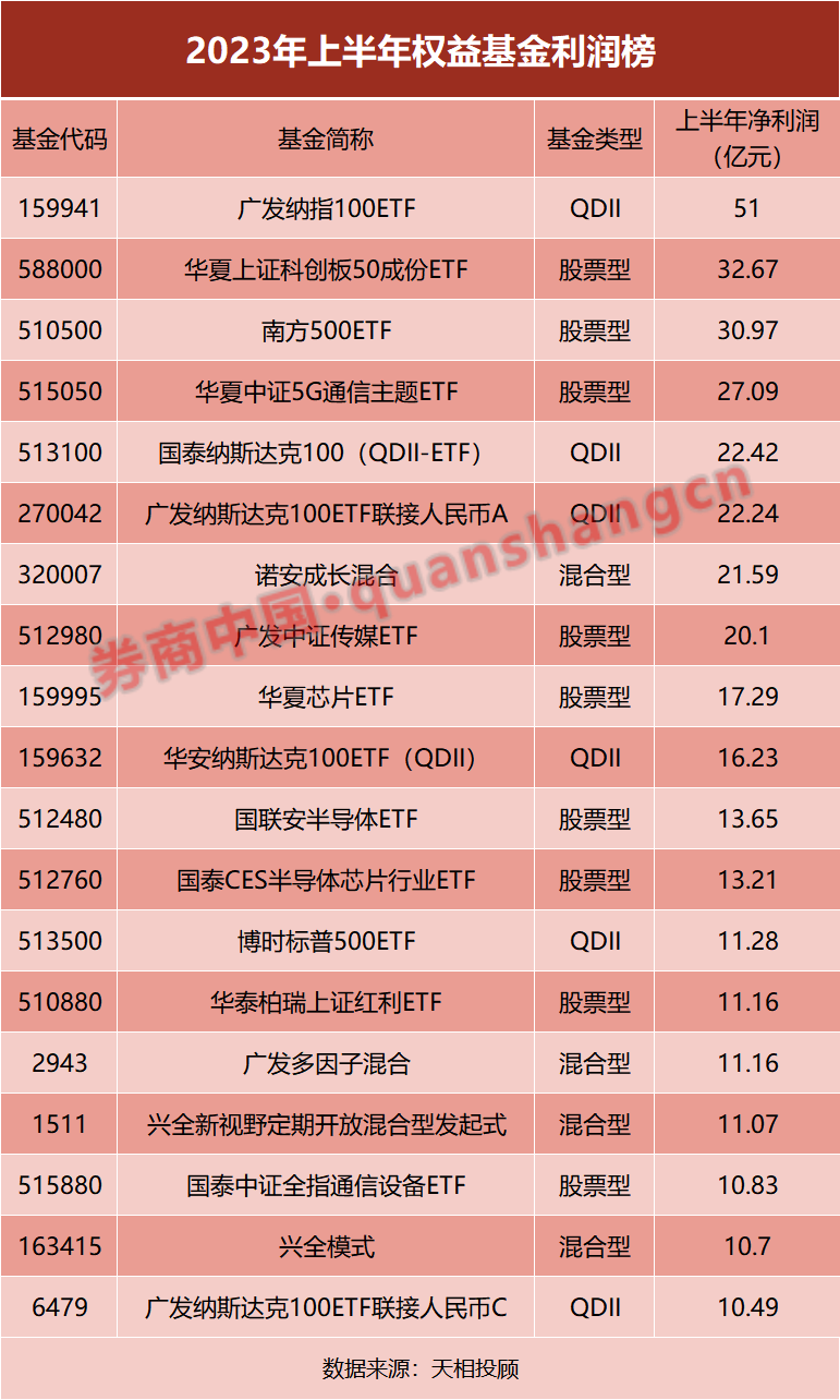 整体来看,还有南方500ETF、华夏中证5G通信主题ETF、国泰纳斯达克100、广发纳斯达克100ETF联接人民币A、广发中证传媒ETF等产品排名靠前,共有8只权益基金在上半年取得了超20亿元的净利润。