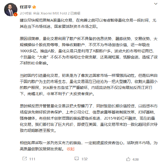 任泽平发文表示,建议尽快规范限制A股量化交易,在完善之前可以考虑暂停量化交易一段时间,尤其在当下市场低迷、国家要活跃资本市场之际。