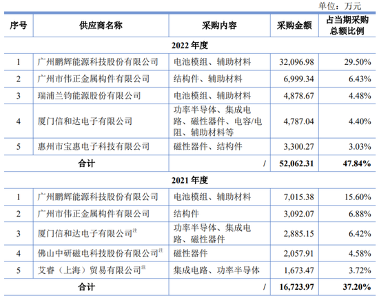 2021-2022年,公司向鹏辉能源采购金额分别为0.70亿元和3.21亿元,占当期采购总额的比例分别为15.6%、29.5%,鹏辉能源在这两年内一直是公司的第一大供应商。