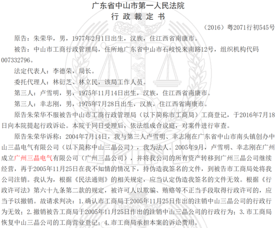 裁判文书网公开的一封裁定书显示,在三晶股份之前,存在着一家中山三晶电气有限公司(下称“中山三晶”),由朱荣华与卢雪明、幸志刚共同创办,朱荣华为其法人。