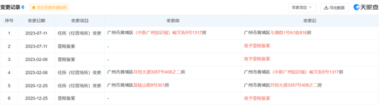 天眼查信息显示,晶创能源成立时的注册地址为广州市黄埔区荔枝山路9号301房。2020年12月25日,晶创能源的注册地址变更为广州市黄埔区开创大道3357号408之二房,2023年2月又变更为广州市黄埔区(中新广州知识城)峻文街5号1317房,2023年7月11日又变更为广州市黄埔区斗塘路1号A1栋816房。