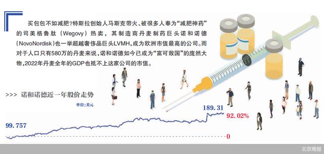 买包包不如减肥?特斯拉创始人马斯克带火、被很多人奉为“减肥神药”的司美格鲁肽(Wegovy)热卖,其制造商丹麦制药巨头诺和诺德(NovoNordisk)也一举超越奢侈品巨头LVMH,成为欧洲市值最高的公司。而对于人口只有580万的丹麦来说,诺和诺德如今已成为“富可敌国”的庞然大物,2022年丹麦全年的GDP也抵不上这家公司的市值。