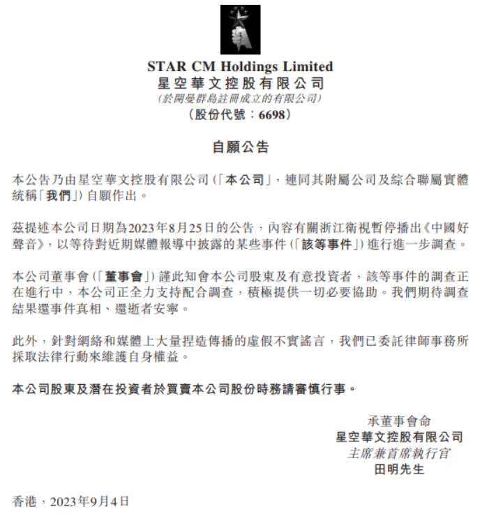 9月4日午间,星空华文在港交所发布公告,有关浙江卫视暂停播出《中国好声音》事件的调查正在进行中,本公司正全力支持配合调查,积极提供一切必要协助。期待调查结果还事件真相、还逝者安宁。