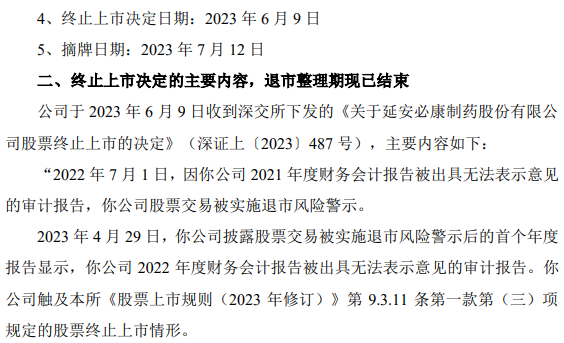 比如,延安必康2022年7月1日因“公司 2021 年度财务会计报告被出具无法表示意见的审计报告”被实施退市风险警示。2023年4月,延安必康2022年财务会计报告被出具无法表示意见的审计报告,而触发终止上市的情形。最终,延安必康于2023年7月12日被摘牌。