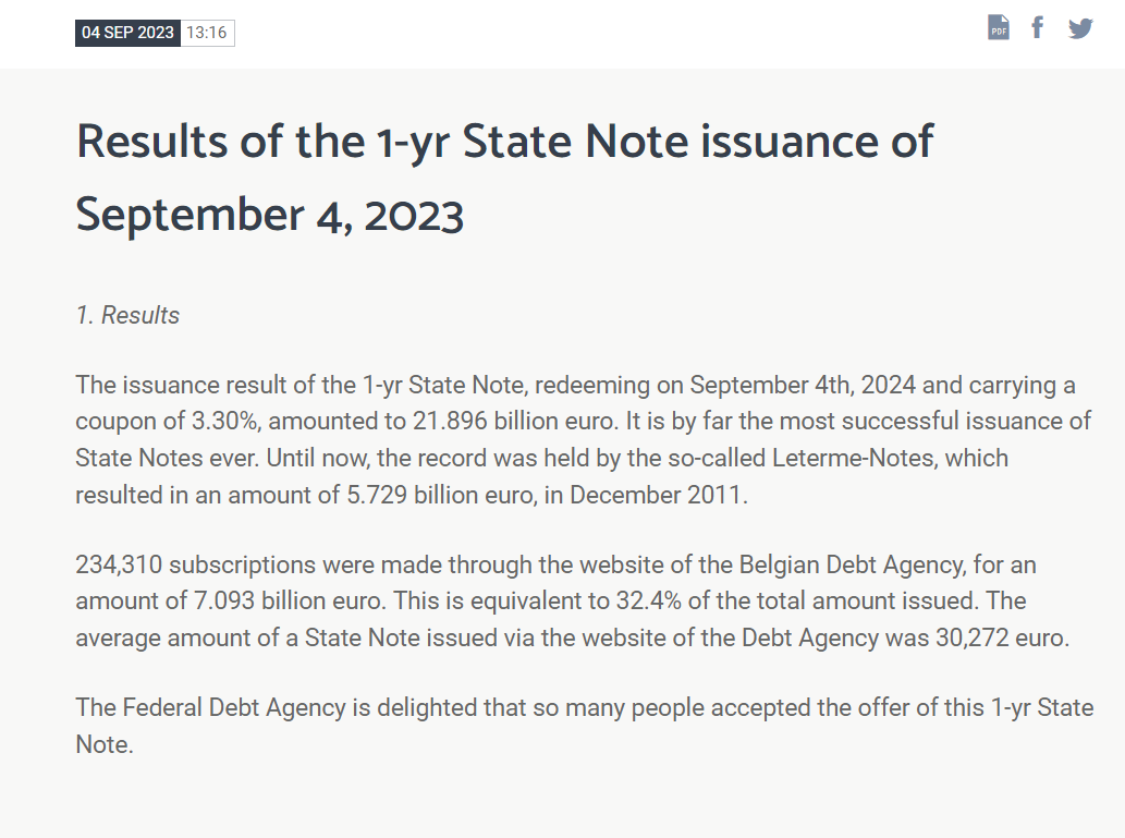 根据最初的发行计划,比利时在整个2023年一共只安排向散户出售2.5亿欧元的国债。经过这一回超火爆的发行后,比利时顺势取消了未来多次的一年期国债发行,一并削减了今年向机构投资者发行国债的计划。该国目前计划在12月再搞一次零售国债发行。