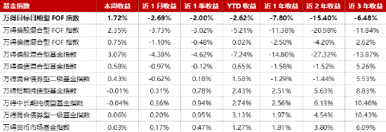 8/24-8/30期间,目标日期型FOF指数上涨1.72%,近95%的目标日期型FOF为正收益,今年以来指数跌幅收窄至-2.62%,表现优于偏股混合型FOF与偏股混合型基金指数。含权益类基金指数本周多获正收益,中长期纯债与短债基金指数小幅收负。