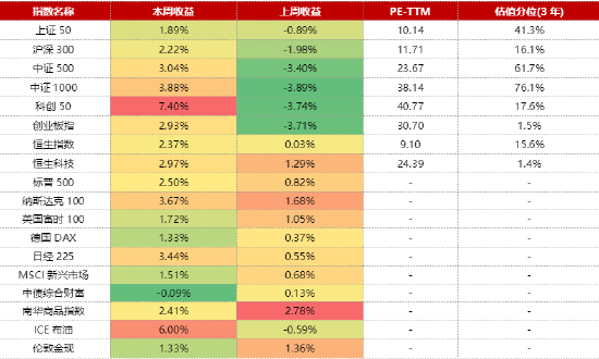 上周(2023/8/28-2023/9/1),A股周一高开低走,市场对印花税减半征收及一系列活跃资本市场政策的反馈不及预期反映交易情绪在经济基本面给出更强烈的向上信号及赚钱效应催生增量资金入场前相对偏弱,机器人板块受个股业绩表现及产能扩张预期带动、芯片半导体板块受华为新品推出、苹果秋季发布会召开在即、半导体周期等因素催化接棒金融板块,成长风格在周中相对强势,周五地产政策再次成为市场交易的重心,中上游周期板块普遍表现较强,整体来看,A股主要股指本周收涨,科创50指数上涨7.4%,债市小幅回调,中债综合财富总值指数下跌-0.09%。恒生指数上涨2.37%,主要海外权益市场指数多上涨。本周原油迎来修复,上涨6%,南华商品指数与黄金分别上涨2.41%与1.33%。