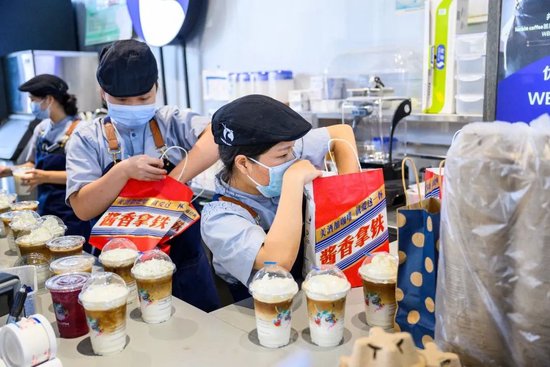 9月4日早上,和茅台联名的酱香拿铁上线之后,易姗发现,自家店里的订单量比昨日同时段翻了一倍,还有许多订单从其他门店飞来。她一边点单,一边提醒顾客,“现在下单要等10分钟”,而后增加到“再等20分钟”“30分钟”。直到有顾客开始要求退单,她不得不在“报时”后补上一句:“有没有等不了的,我帮您退单。”