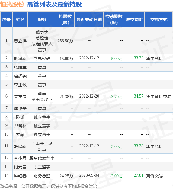 证券之星讯,根据9月5日市场公开信息、上市公司公告及交易所披露数据整理,恒光股份(301118)最新董监高及相关人员股份变动情况:2023年9月4日公司高管谭艳春共减持公司股份2.0万股,占公司总股本为0.0187%。变动期间公司股价上涨4.77%,9月4日当日收盘报27.87元。
