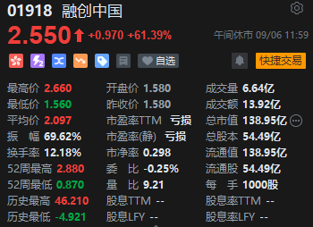 内房股与物管股逆势高涨,融创中国大涨超61%领衔。消息面上,根据上交所、深交所公告,港通下港股通标的名单发生调整,并自2023年9月5日起生效。其中融创中国等22股获纳入。另外,9月4日下午,融创中国发布的海报显示,公司北京项目“融创壹号院”热销,每套房3000万起,总认购金额达到56.2亿元。