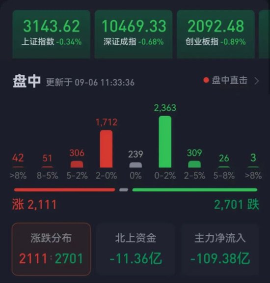 周三(9月6日),三大股指继续震荡整理。截至上午收盘,上证指数跌幅达0.34%,报3143.62点;深证成指和创业板指跌幅分别为0.68%和0.89%;沪深两市合计成交额4356.6亿元,总体来看,两市个股跌多涨少。其中,29只个股涨停,1只个股跌停。