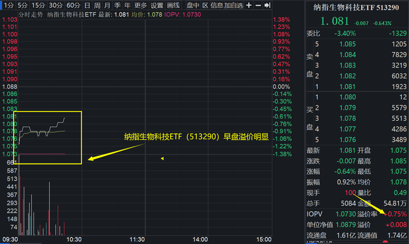 值得注意的是,纳指生物科技ETF(513290)盘中溢价明显,反映买盘力道强劲,资金布局意愿强烈!