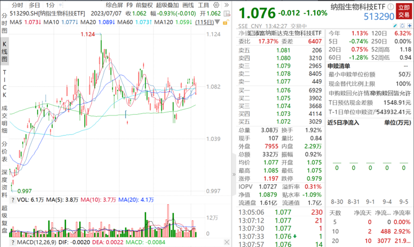 9月6日,主流ETF方面,表征美股医药行情的国内唯一纳指生物科技ETF(513290)低开,现跌1.10%。