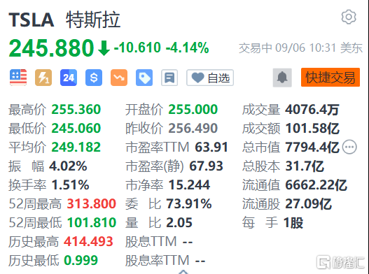 格隆汇9月6日|特斯拉(TSLA.US)跌超4%,报245.88美元。消息面上,近日印尼海洋与投资统筹部长卢胡特在彭博首席执行官论坛上表示,特斯拉CEO马斯克“对全球经济状况和电动汽车市场可能出现的产能过剩感到担忧”,特斯拉“在未来1至3年内没有扩张计划”。