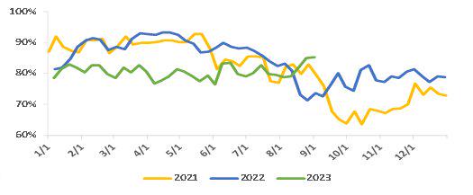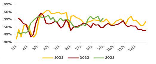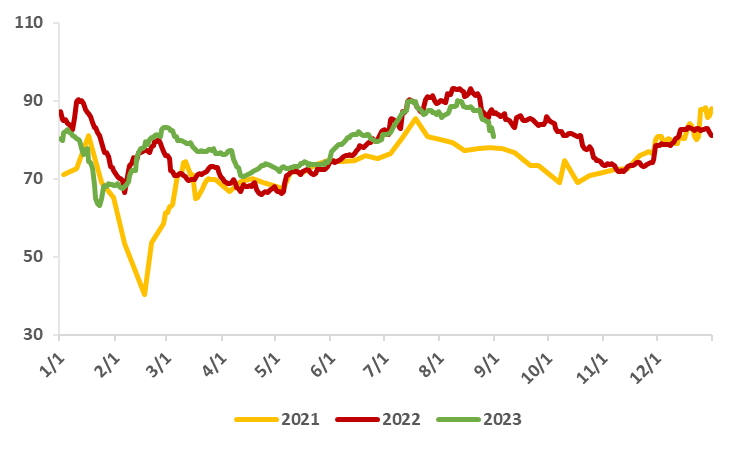 部分煤头装置开始兑现秋季检修,但亦有安徽碳鑫和国泰化工等装置重启。秋检规模暂时不大,甲醇开工率回升至同期高位后供应端仍存压力。