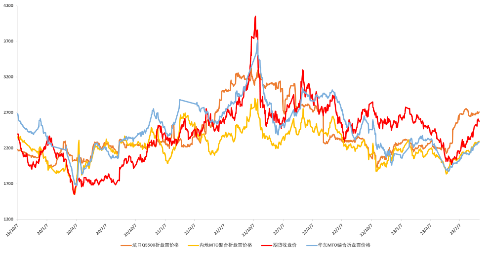 近期甲醇上冲至最高2654元/吨后承压回落,目前在2600元/吨附近盘整运行。虽然夏宝丰三期50万吨/年新建MTO装置已正常运行,但供应维持高位和港口的不断累库仍然压制了价格的进一步上行。