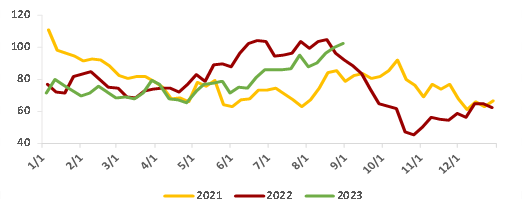 甲醇基本面呈现供需双增的态势,但随着甲醇价格的连续上涨,其估值的绝对水平已抬升至中等偏上。此外,9月到港量偏多,港口依旧呈现累库格局。当前下游对高价甲醇的抵触情绪已有部分显现,建议前期多单可适当止盈减磅、落袋为安。2600元/吨一线压制明显,单边继续追多风险较大,而后期冬季限气停车和燃料需求增加的预期仍在,因此建议逢回调后再布局多单。