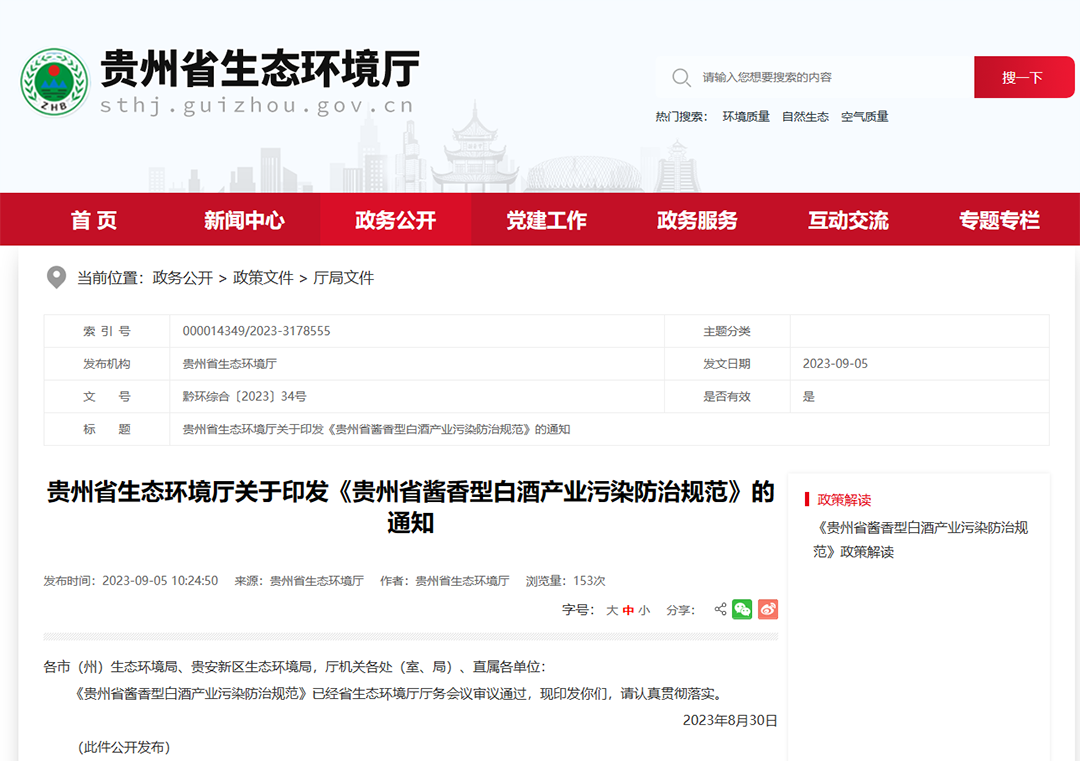 8月30日,贵州省生态环境厅印发了《贵州省酱香型白酒产业污染防治规范》(下称《规范》,全文详见文末)。