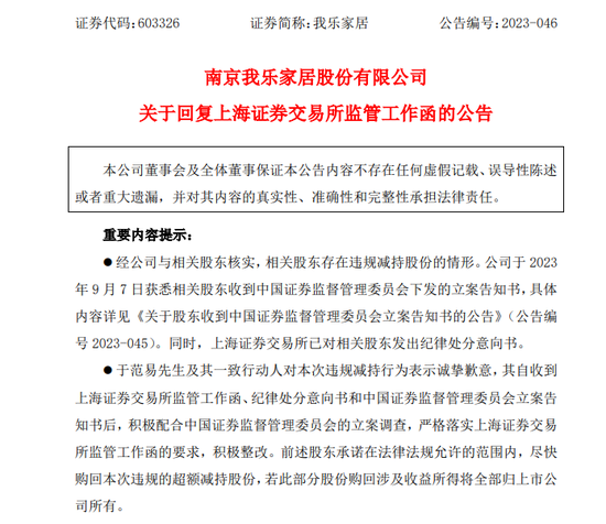 公告显示,“于范易及其一致行动人对本次违规减持行为表示诚挚歉意,其自收到上交所监管工作函、纪律处分意向书和证监会立案告知书后,积极配合证监会的立案调查,严格落实上交所监管工作函的要求,积极整改。前述股东承诺在法律法规允许的范围内,尽快购回本次违规的超额减持股份,若此部分股份购回涉及收益所得将全部归上市公司所有。”