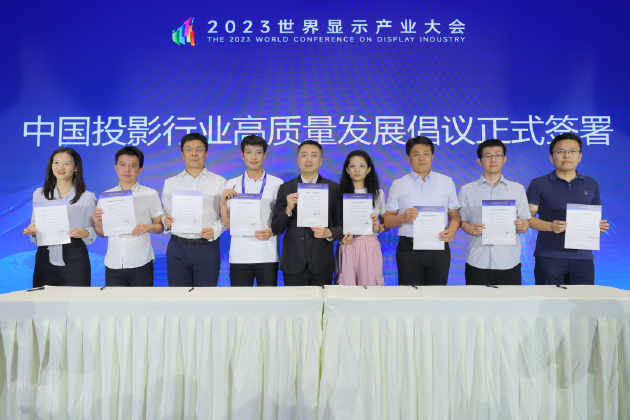 在主题会上,中国电子视像行业协会投影显示产业分会联合极米、海信、坚果、光峰、长虹、优派和索诺克,以及主流电商平台京东、天猫和抖音共同签署《中国投影行业高质量发展倡议》。
