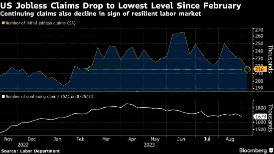 截至8月26日的一周,持续申领人数降至168万人。这是自7月以来的最低水平。